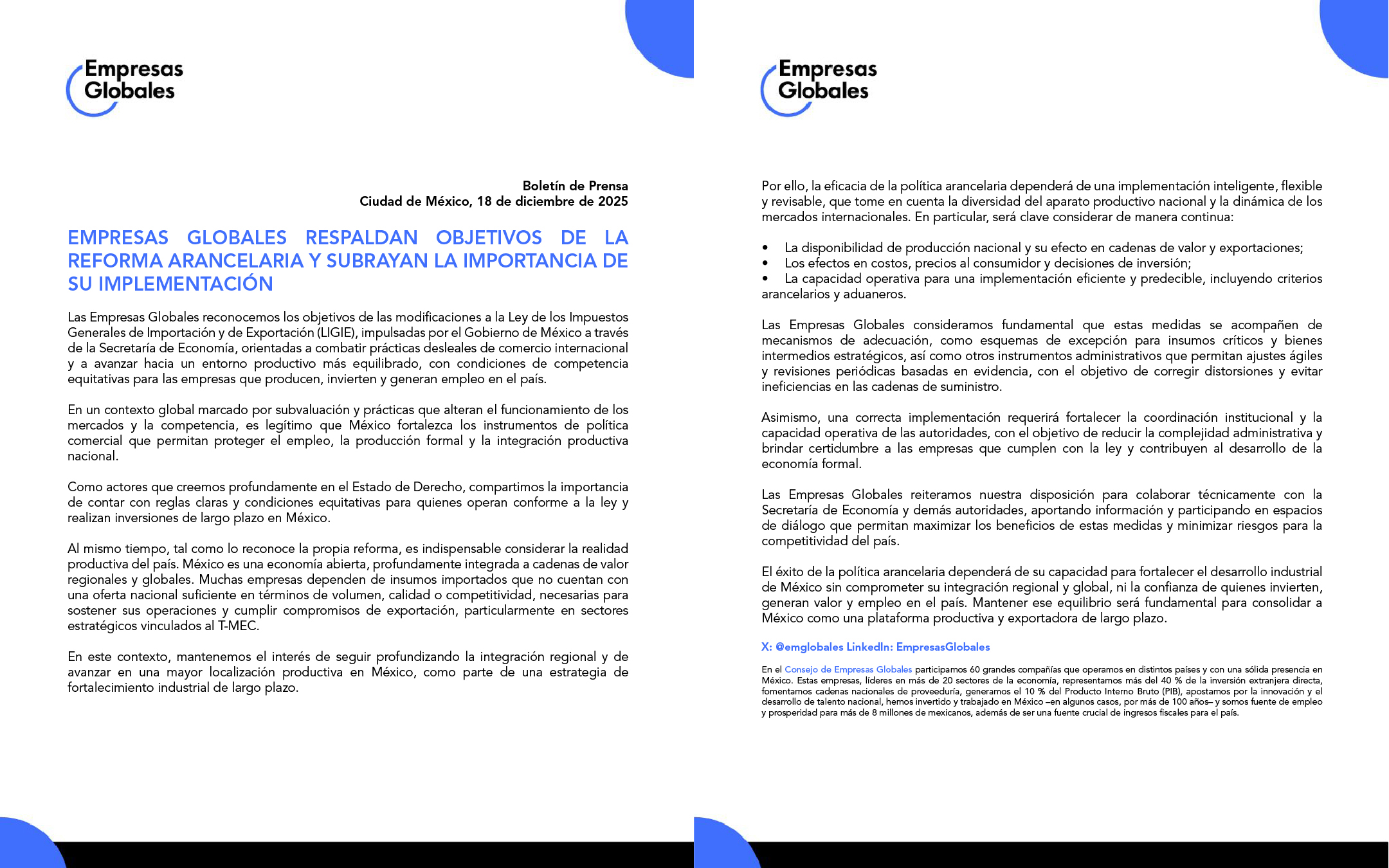 Las Empresas Globales reiteramos nuestra disposición para colaborar técnicamente con la Secretaría de Economía y demás autoridades, aportando información y participando en espacios de diálogo que permitan maximizar los beneficios de estas medidas y minimizar riesgos para la competitividad del país.